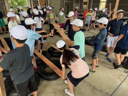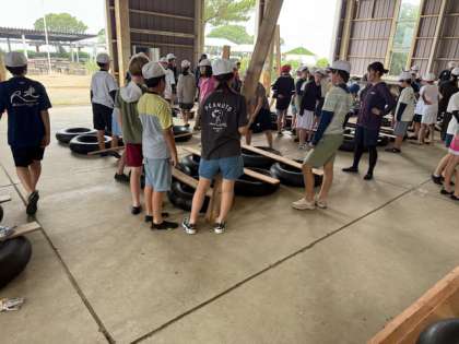 みんなでイカダを組み立て中