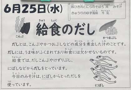 給食のだしは、こんぶや、けずりぶしなども使いますが、今日はにぼしからとっています。