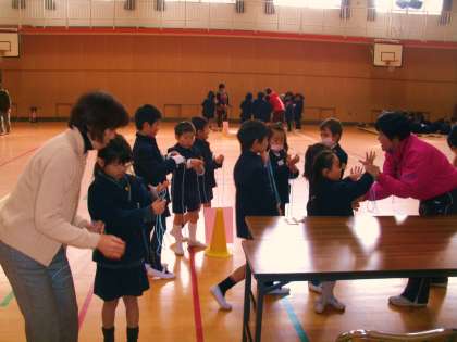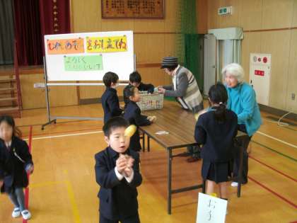 今日は地域の中大江敬寿会・女性会・北大江寿会の方々が来校され、1年生を対象にして恒例の「昔遊びを教えて」の会が講堂でにぎやかに開かれました。昔からの家庭遊びを昔遊びのプロともいえる地域の方に丁寧に教えていただきました。昔遊びには、遊びを通して年齢や性別の垣根を越え、人と人とを結びつけ、みんなを笑顔に変える力があります。老若男女楽しく遊ぶ姿の中に、子どもを子どもらしく、人間を人間らしくする魅力があるように感じました。