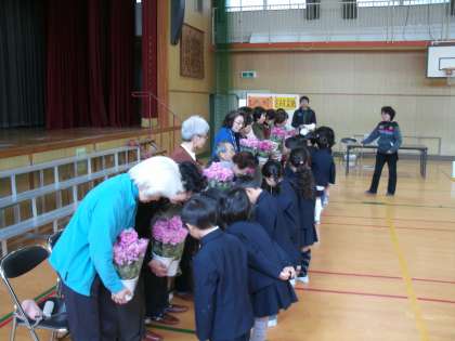 3時間目。講堂では1年生が会場を去った後、昨年度昔遊びを教えていただいた2年生が、これまでのお世話になったお礼の意味をこめて地域の方々にお花と「ありがとうの花」の元気な歌声をプレゼントしました。
