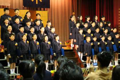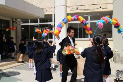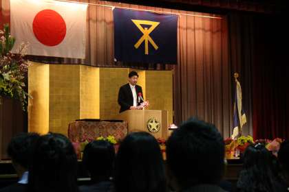 「卒業生の将来の夢に感動しました。私の好きな言葉[人は誰もが天才である]、という言葉を皆さんに贈ります。」と祝辞を述べる川辺PTA会長。
