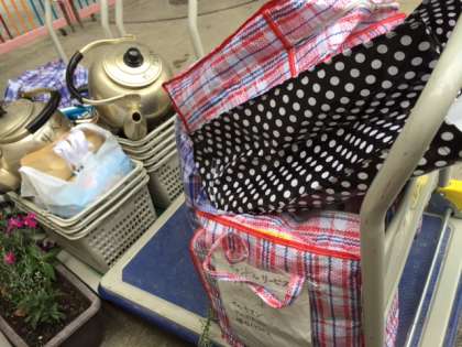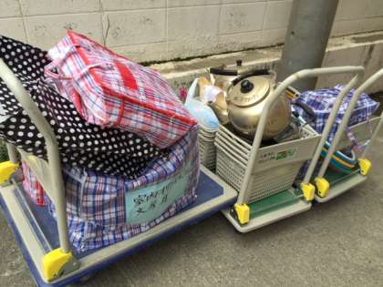 6年生が淡路島に出発します。台車3台の荷物を担任が準備しました 台車ごとバスに積み込みます。