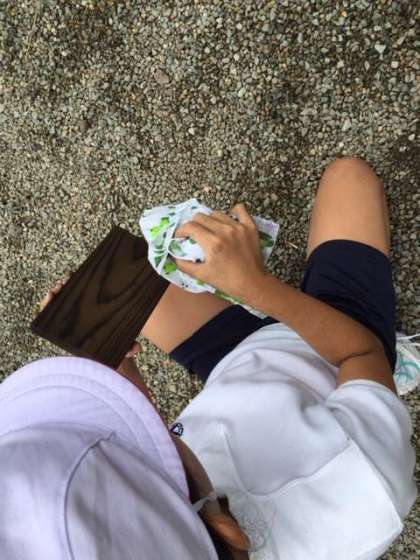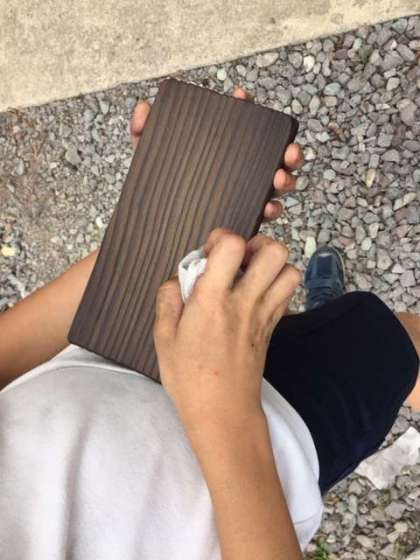 見本のようなハチ高原の思い出をつくります。まずは、板を磨きます。