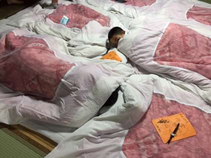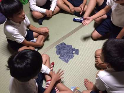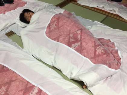 夕食後 部屋へ戻ると布団が敷いてありました。少し休憩する人やトランプで遊ぶ人がいました