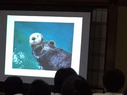 ラッコの飼育をされている方で、その生態について詳しく 楽しく教えていただきました。画面はラッコが自分の熱を顔や耳 手足など、毛の生えていない部分から逃がしている様子だそうです。