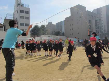 今日は土曜授業でした。2時間目の学習参観と3時間目の大阪城学習の合間の休み時間、運動場では2度目の長なわとび大会を行いました。どの学級の先生や子どもたちも、前回よりも一回でも記録を伸ばそうと大きな掛け声に合わせて軽やかに縄を飛び越す姿がとてもさわやかでした。