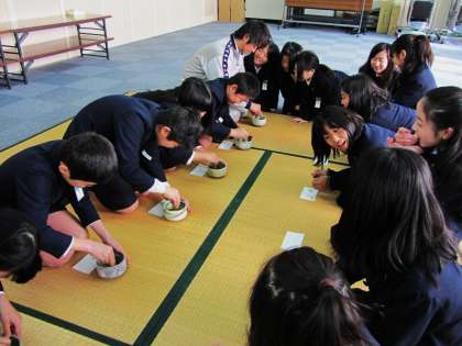 あいさつの仕方に始まり、お茶の種類・歴史・たて方などを教わり、いよいよ実践。田中先生は、「お茶をとおして、おもてなしの心と『お先にちょうだいいたします。』『お点前ちょうだいいたします。』という感謝の心を学んでほしい。」とおっしゃっていました。