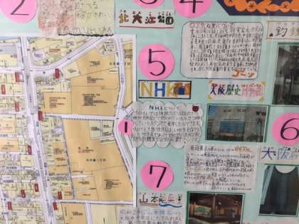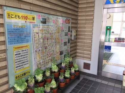 新しくなった玄関掲示です。 PTAの方による 「子ども110ばんの家」 と児童による 「校区内の名所、史跡」 の場所の地図です。