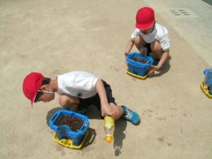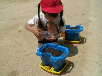 うえきばちにつちをいれ、あさがおのたねをまきました。
