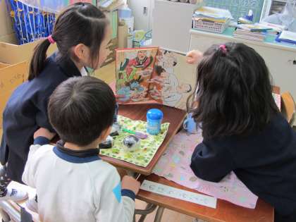 当番を待つ間に絵本を読んであげたり、給食後に昔遊びをしたりと楽しい交流もできました。