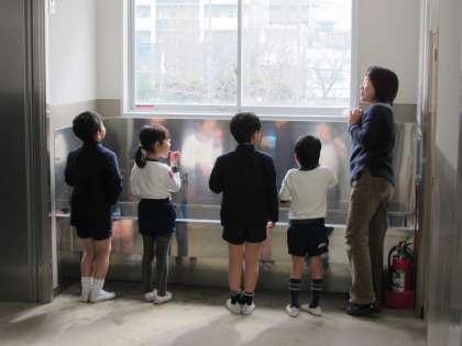 4月に入学する中大江幼稚園のきく組のお友だちが給食を見学に来ました。当番の仕事ぶりやメニューを見て、小学校の給食の様子が少しわかったかと思います。
