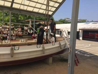 ボートフック係の人が先に降りてから、櫂を下ろします。