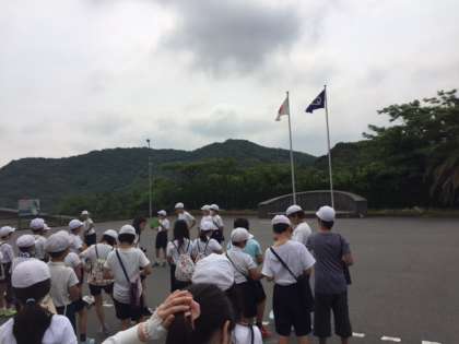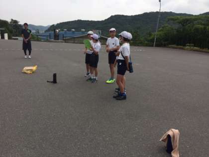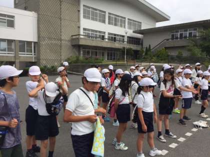 ディスクゴルフに出発します。担当の係の人が活動内容の確認をしています。全ての活動を全児童で分担担当しています。