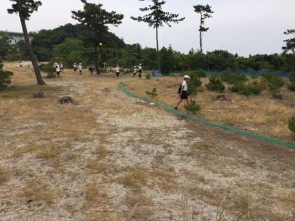 涼しい風がふきはじめました。投げたディスクが風の影響を受けています。