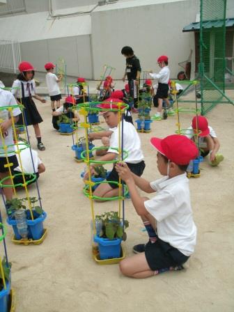 あさがおの支柱をたてました。