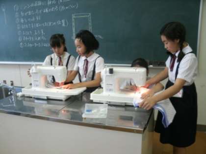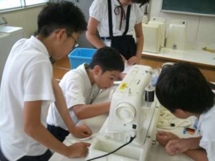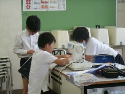 家庭科の学習ではミシンを使ってナップサックを作っています。