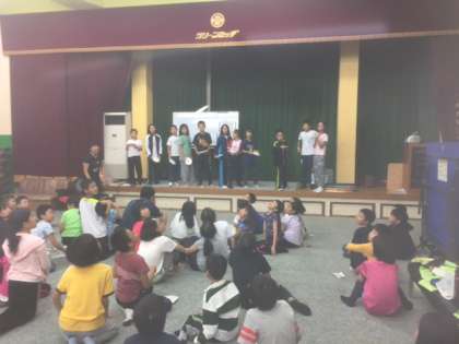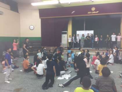 1階ホールで室内オリンピックをしています。円盤投げではなく、紙皿飛ばしをしています。