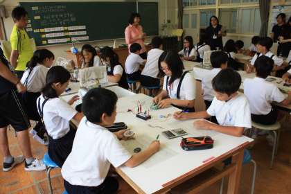 本校では、本年度大阪市「理科教育推進モデル校事業」の委嘱を受け、理科教育を校内研究の柱にして、「サイエンスへの夢・サイエンスを楽しむ心を育み、自然環境・事象に能動的にかかわり続ける子ども」の育成を目指し、今年度の研究テーマを「小学校1年生からの系統的な理科教育の推進〜「見通し」「ふりかえる」場の設定のあり方」として、全学年の授業研究会を計画しています。 今日はその第1回目。6年1組の根岸学級で「豆電球と発光ダイオードの違いを理解させる」ことをめあてに、手回し発電機の回転数と両方の発光時間の比較実験の研究授業を行いました。