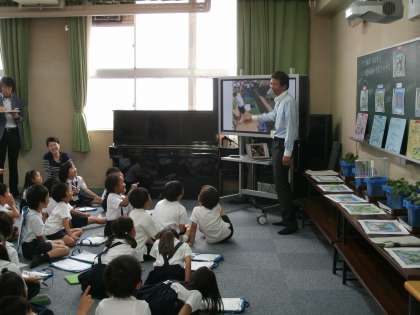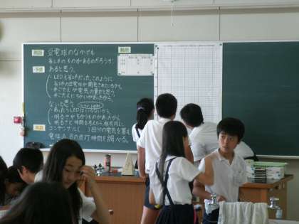 雨模様にもかかわらず、堺市及び大阪市内の幼稚園・小・中学校から約100人以上の先生方が熱心に参観される中、多目的室で1年1組が「あさがおのひみつ」、理科室では6年2組が「発電と電気の利用」の授業に取り組みました。