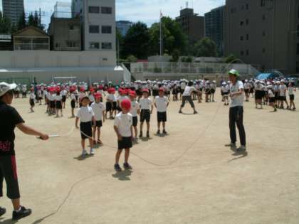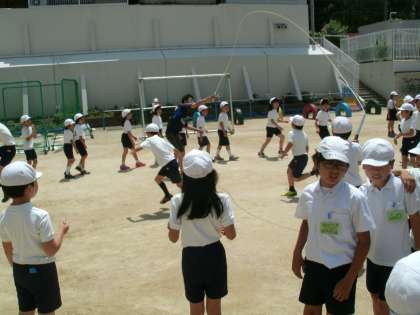 日差しがまぶしい2時間目の休み時間、子どもたちは流れる汗も気にせず、大きな掛け声に合わせて10分間の制限時間いっぱいまで元気に跳び続けていました。