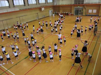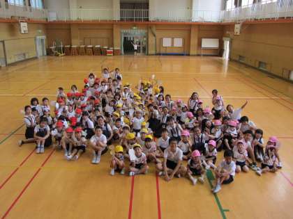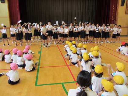 つづいて5年生がGreeeenの「あいうえおんがく」を元気に歌いました。ソロ・パートもあり大いに盛り上がりました。歌いながら振っていたペープサートは、お土産にプレゼントしました。