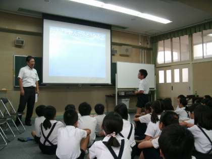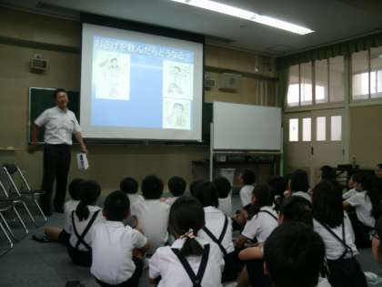 東警察署の方に来ていただいて、子ども達にお話をしていただきました。