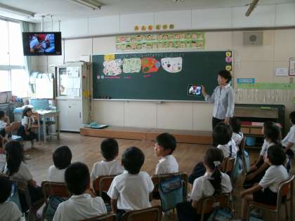 5時間目は1年2組の田中学級の研究授業。生活科「いきものいっぱい なかおおえ」の単元を通して、公園や校庭でみつけた植物や生きものの発表をしあう授業でした。