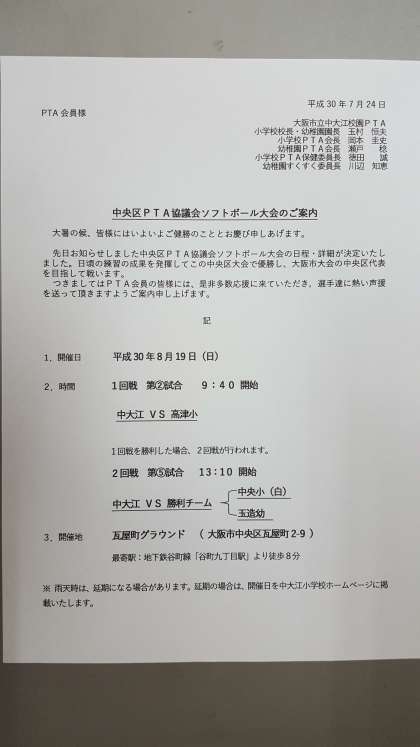 区PTAソフトボール大会の日程と対戦相手が決まりましたのでお知らせします。