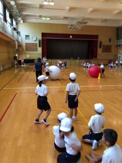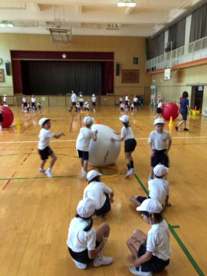 体より大きな玉を二人でバランスを保って転がしています。あっちへコロコロこっちへコロコロ、力加減が大切ですね。