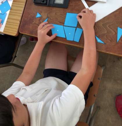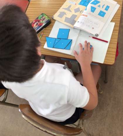 いろいろな三角形や四角形を組み合わせてパズルをするところから、形の決まりに気づいていきます。試行錯誤しながら、交流する様子が楽しそうです。