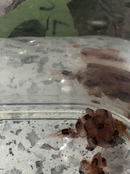 休み時間に2年生の廊下で歓声が上がりました。ザリガニの卵が孵ったようです。1cmに満たないかわいい命の誕生です。後ろの洗濯バサミが大きく見えますね。