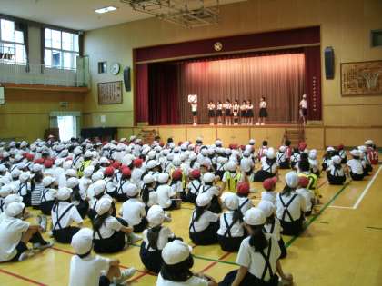 今朝の児童集会は図書委員会の発表でした。図書委員会では図書館の昼休みの開放や図書室の整頓などの活動をしながら、子どもたちが読書好きになるようにポスターや読書週間のとりくみなどにがんばっています。
