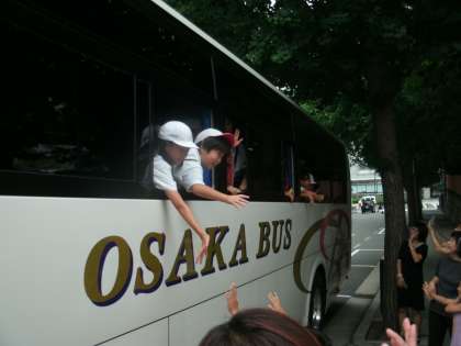雨雲がしだいに近づきつつある薄曇りの中、39名全員の子どもたちが無事集合し、家族や教職員の大きな声援に見送られて、兵庫県ハチ高原に向けてにぎやかに出発しました。
