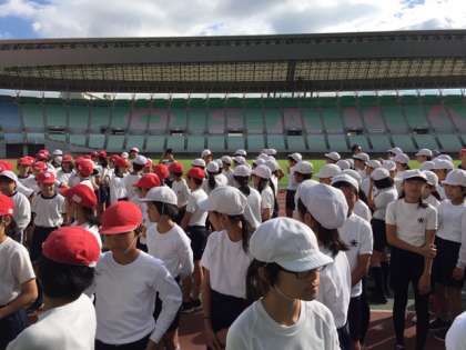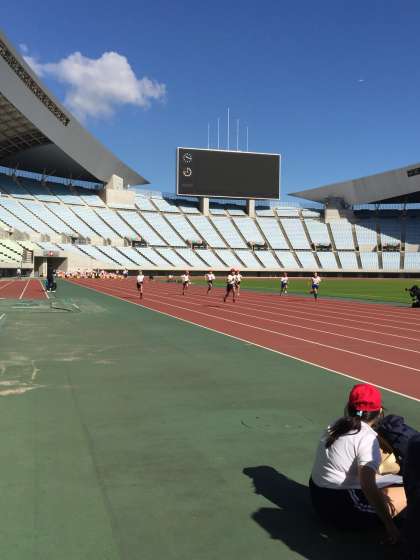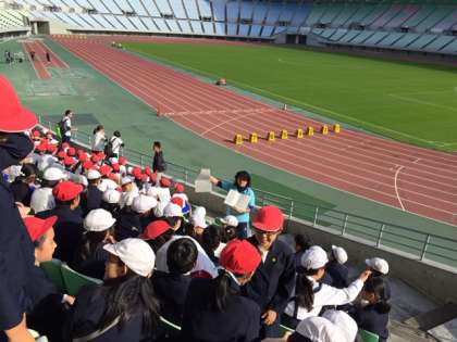 大阪市の小学六年生のが集まり、スポーツを通して交流します。100m走が始まりました。本物の陸上競技場です。地面の固さが初体験です。
