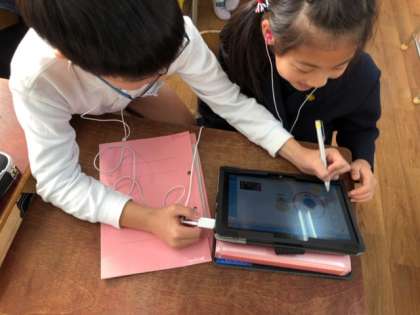二人一組で、3ヒントクイズWHAT'S THIS?を作り、タブレットパソコンで出題します。発音の練習や語彙の習得を楽しみながら学ぶことができました。