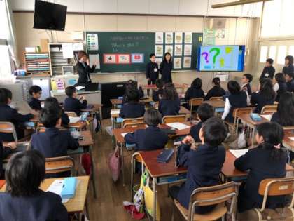 タブレットパソコンで作った3ヒントクイズを出し合っています。干支の動物の色、大きさ、食べ物から答えを導き出します。上手に出題できました。