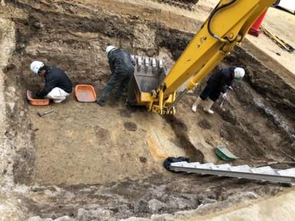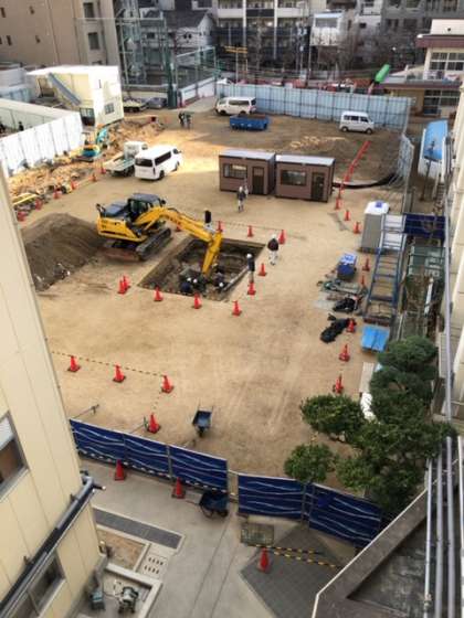 校舎建設に伴った発掘工事が始まりました。この穴の底は江戸時代の地層。この土地はずっと地上にあったので、そのすぐ下は弥生や縄文時代になるそうです。