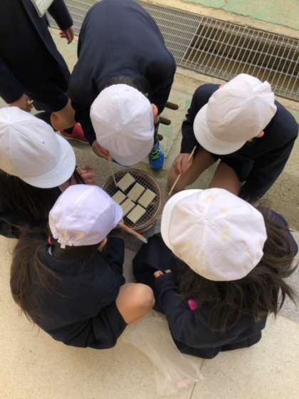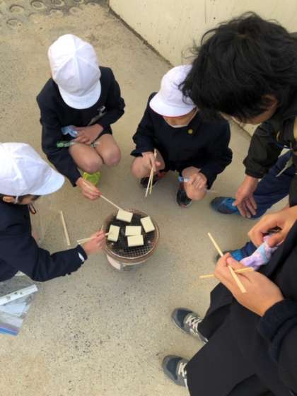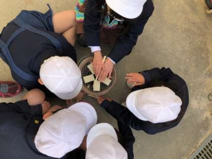 七輪を使って火起こしをし、炭火でお餅を焼きました。火起こしの大変さや、炭火の香りなどいろんな感覚を使って学ぶことができました。