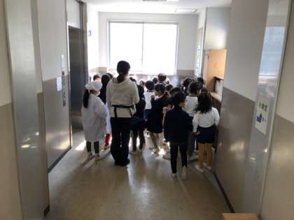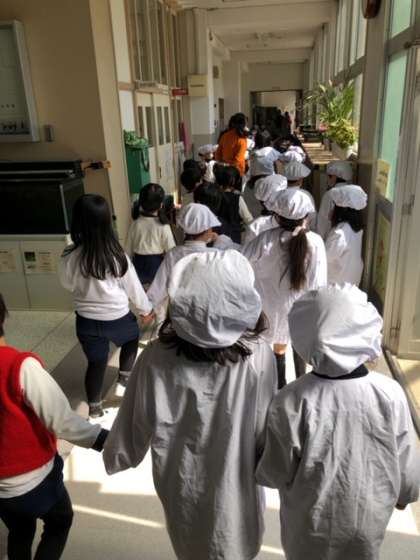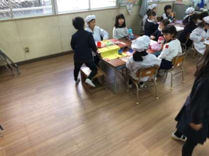 もうすぐ一年生になる年長さんが一年生の給食の見学に来ました。準備から片付けまで見学した後、一年生が先日地域のみなさんに教わったカブトの折り紙のプレゼントをしました。
