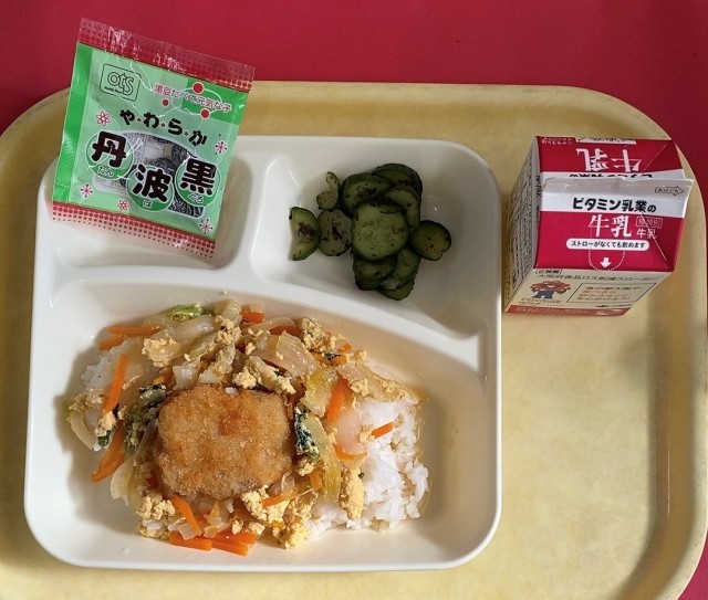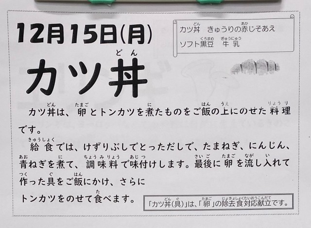 かつ丼は、トンカツと卵を煮たものをご飯にのせた料理ですが、給食のかつ丼は卵でとじた具の上にカツをのせるようになっています。
