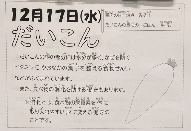 だいこんは、水分が多く、ビタミンCや食物繊維などがふくまれています。