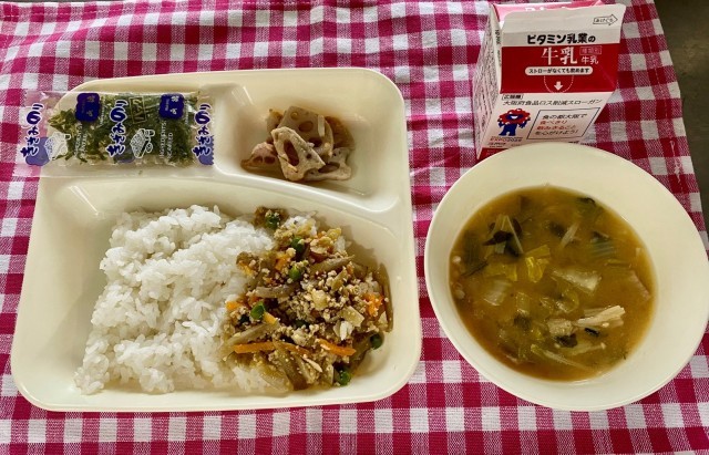 今日は、鶏ごぼうご飯にきざみのり、みそ汁、焼きれんこんでした。