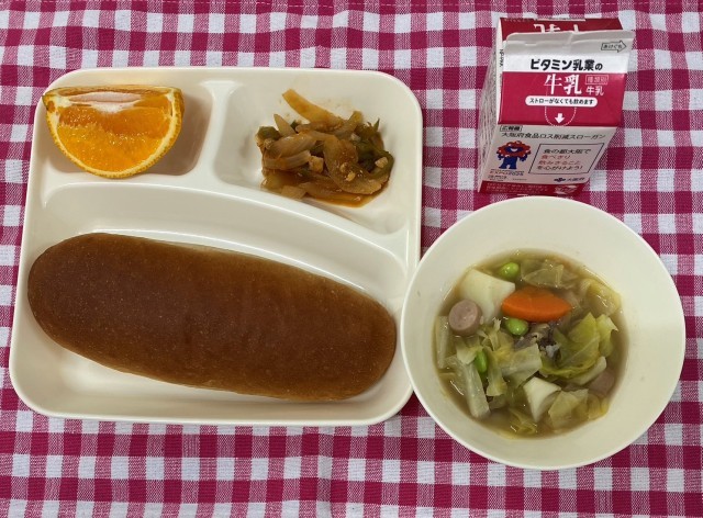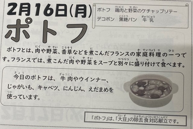 ポトフはフランスの家庭料理ですが、給食では、牛肉、ウインナー、じゃがいも、キャベツ、にんじん、えだまめを使っています。