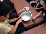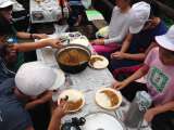 釜の担当のグループが火を熾している間に、調理担当のグループは具材のニンジンやジ...