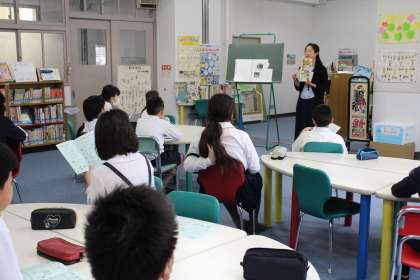 本の分類や図書館の使い方などを、学年に応じてわかりやすく説明していただいたのちに、本のなかまわけクイズや、本のラベルビンゴなどをして楽しく図書について学びました。