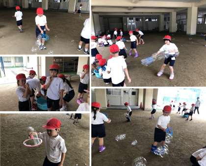 生活科の時間に、いろいろなシャボン玉を作って遊びました。