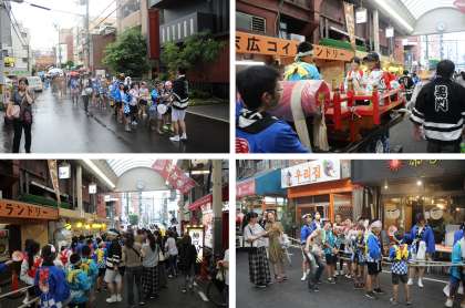 市場の方々の先導のもと、児童はまくら太鼓に結び付けられた縄を握り、雨に負けず、元気よく引っ張って市場内を練り歩きました。