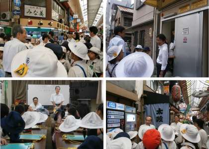 3年生が社会科の学習で黒門市場見学を行いました。まず、黒門市場商店街振興組合理事長・山本善規様、そして、三都屋の店主 北岡裕一様からのお話を聴きました。続いて黒門市場内を案内していただきました。案内では、様々なお客さんに対応するための工夫や「なぜ、有名なのか」の黒門市場の特徴、「どんなふうにしてできたのか」等の歴史を説明していただきました。学習内容を深める見学となりました。