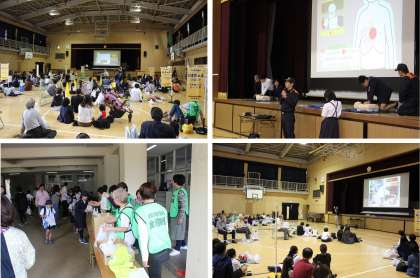 避難訓練の後、親子で地域のブロックごとに講堂に集まりました。昨年の大阪で発生した地震の映像を見て、地震の恐ろしさを学び、地震の仕組みや地震が起こった際に備えて今から気をつけるべきことを学習しました。また中央消防署の方からは、心肺蘇生法とAEDの使い方について、学習アプリを用いてわかりやすく説明していただきました。