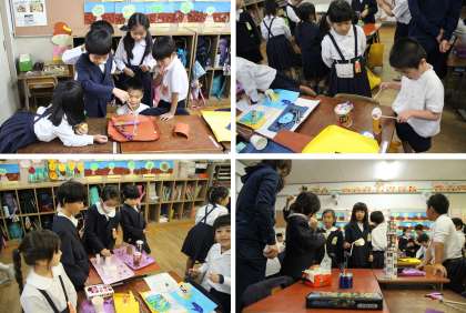 1年生が生活科の学習でどんぐりを使ったおもちゃをつくり、2年生を招待して一緒に遊びました。